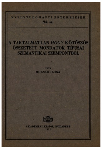 Molnár, Ilona (1977) A tartalmatlan hogy kötőszós összetett mondatok típusai szemantikai szempontból. Nyelvtudományi értekezések (94). Akadémiai Kiadó, Budapest. ISBN 963-05-1243-2
