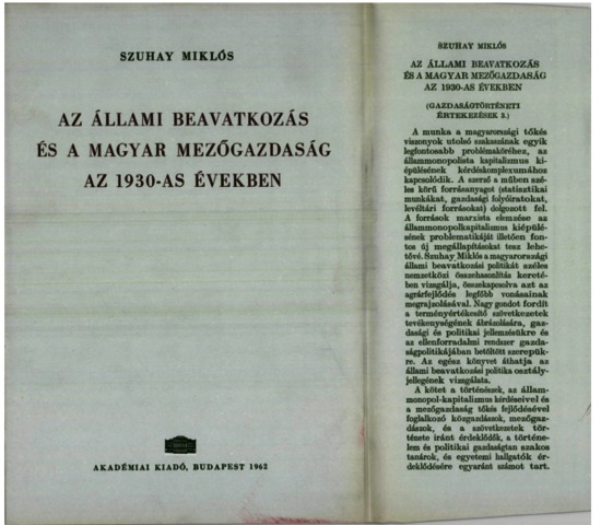 Szuhay, Miklós (1962) Az állami beavatkozás és a magyar mezőgazdaság az 1930-as években. Gazdaságtörténeti értekezések (3). Akadémiai Kiadó, Budapest.