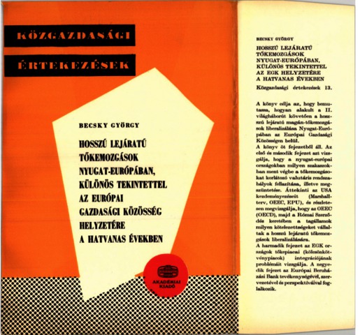 Becsky, György (1970) Hosszú lejáratú tőkemozgások Nyugat-Európában, különös tekintettel az Európai Gazdasági Közösség helyzetére a hatvanas években. Közgazdasági értekezések (13). Akadémiai Kiadó, Budapest.