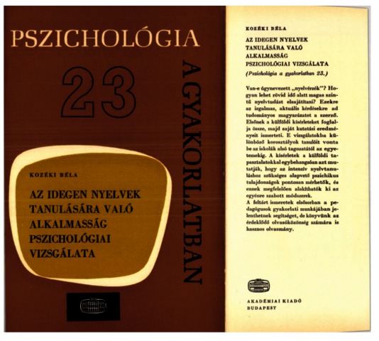 Kozéki, Béla (1973) Az idegen nyelvek tanulására való alkalmasság pszichológiai vizsgálata. Pszichológia a gyakorlatban (23). Akadémiai Kiadó, Budapest.