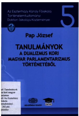 Papp, József (2014) Tanulmányok a dualizmus kori magyar parlamentarizmus történetéből. Az Eszterházy Károly Főiskola Történelemtudományi Doktori Iskolája közleményei (5). Akadémiai Kiadó, Budapest. ISBN 978-963-05-9510-0