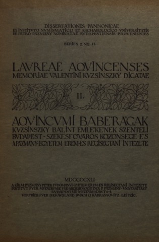 UNSPECIFIED, ed. (1941) Aquincumi babérágak : Kuzsinszky Bálint emlékének szenteli Budapest székesfőváros közönsége és a Pázmány-Egyetem Érem- és Régiségtani Intézete. Dissertationes Pannonicae ex Instituto Numismatico et Archaeologico Universitatis de Petro Pazmany Nominatae Budapestinensis Provenientes, 2. series (11). Királyi Magyar Pázmány Péter Tudományegyetem Érem- és Régiségtani Intézete, Budapest.