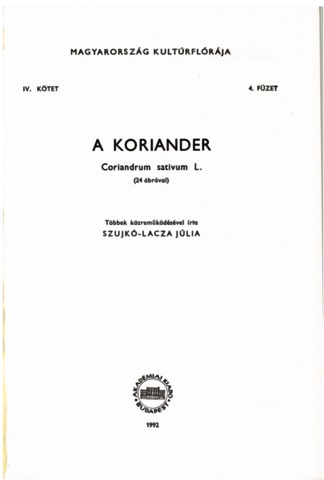 Szujkóné Lacza, J. (1992) A koriander - Coriandrum sativum L. (IV/4.). Magyarország kultúrflórája (64). Akadémiai Kiadó, Budapest. ISBN 963-05-6401-7