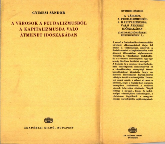 Gyimesi, Sándor (1975) A városok a feudalizmusból kapitalizmusba való átmenet időszakában : funkcionális és strukturális változások Nyugat- és Közép-Kelet-Európa városhálózatában, különös tekintettel Magyarországra. Gazdaságtörténeti értekezések (7). Akadémiai Kiadó, Budapest. ISBN 963-05-0653-X