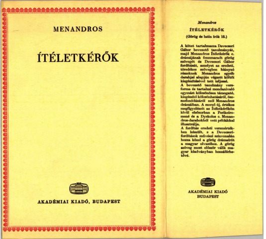 Menandros, (1971) Epitrepontes = Ítéletkérők. Görög és latin írók (15). Akadémiai Kiadó, Budapest.