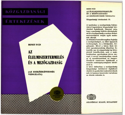 Benet, Iván (1973) Az élelmiszertermelés és a mezőgazdaság : az eszközigényesség vizsgálata. Közgazdasági értekezések (19). Akadémiai Kiadó, Budapest.