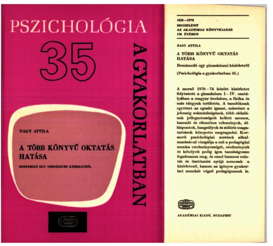 Nagy, Attila (1978) A több könyvű oktatás hatása : beszámoló egy gimnáziumi kísérletről. Pszichológia a gyakorlatban (35). Akadémiai Kiadó, Budapest. ISBN 963-05-1459-1