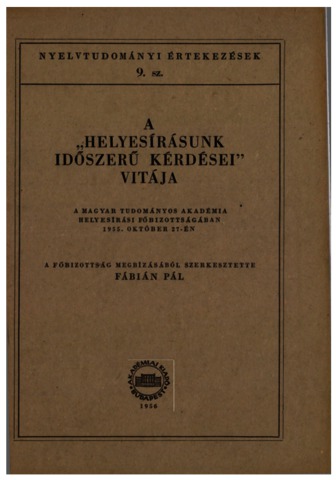 Fábián, Pál, ed. (1956) A "Helyesírásunk időszerű kérdései" vitája a Magyar Tudományos Akadémia Helyesírási Főbizottságában 1955. október 27-én. Nyelvtudományi értekezések (9). Akadémiai Kiadó, Budapest.