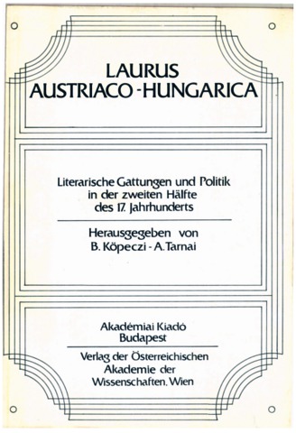 Köpeczi, Béla and Tarnai, Andor, eds. (1988) Laurus Austriaco-Hungarica : literarische Gattungen und Politik in der zweiten Hälfte des 17. Jahrhunderts. Schriftenreihe der Österreichisch-Ungarischen Gemischten Kommission für Literaturwissenschaft (1). Akadémiai Kiadó - Verlag der Österreichischen Akademie der Wissenschaften, Budapest - Wien. ISBN 963-05-4906-9 6