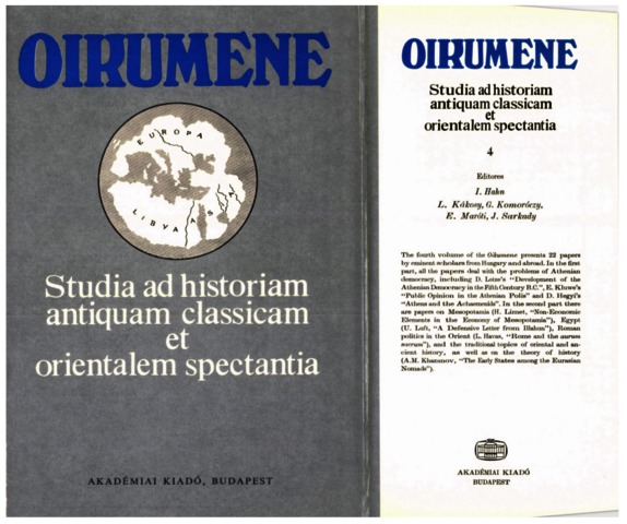 Hahn, I. and Kákosy, L. and Komoróczy, G. and Maróti, E. and Sarkady, J., eds. (1983) Oikumene IV. Studia ad historiam antiquam classicam et orientalem spectantia (4). Akadémiai Kiadó, Budapest. ISBN 963 05 2961 0