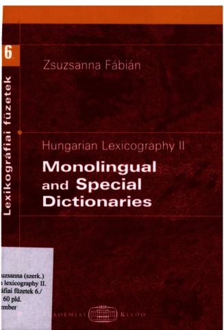 Fábián, Zsuzsanna (2012) Hungarian lexicography II. : Monolingual and special dictionaries. Lexikográfiai füzetek (6). Akadémiai Kiadó, Budapest.