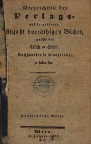 UNSPECIFIED, ed. (1836) Verzeichniss der Verlags- und in grosserer Anzahl vorräthigeb Bücher. Tilsch et Sohn, Wien.