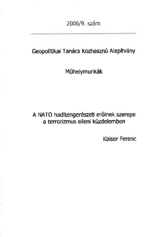 Kaiser, Ferenc (2006) A NATO haditengereszeti erőinek szerepe a terrorizmus elleni küzdelemben. Műhelymunkák (9). Geopolitikai Tanács Közhasznú Alapítvány, Budapest.
