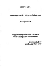 Szternák, György (2006) Magyarország lehetséges szerepe a NATO válságkezelő műveleteiben. Műhelymunkák (5). Geopolitikai Tanács Közhasznú Alapítvány, Budapest.