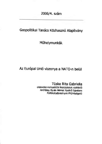 Tüske, Rita Gabriella (2006) Az Európai Unió viszonya a NATO-n belül. Műhelymunkák (4). Geopolitikai Tanács Közhasznú Alapítvány, Budapest.