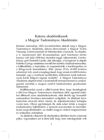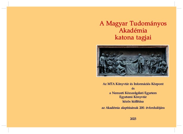 Kiállítási katalógus. Időszaki kiállítás a Magyar Tudományos Akadémia alapításának 200. évfordulójára, 2025. október 15. – november 30. Zrínyi Miklós Laktanya és Egyetemi Campus, NKE EK, Hadtudományi és Honvédtisztképző Kar Kari Könyvtár. A kiállítást az MTA Könyvtár és Információs Központ, a HM Hadtörténeti Intézet és Múzeum Hadtörténeti Könyvtár, a Nemzeti Közszolgálati Egyetem Egyetemi Könyvtár anyagát fölhasználva rendezte: Alapítvány a Magyar Hadi Történetírásért, MTA Hadtudományi Bizottság, Magyar Hadtudományi Társaság, Ludovika Történelmi Kutatóműhely, Nemzeti Közszolgálati Egyetem Egyetemi Könyvtár.