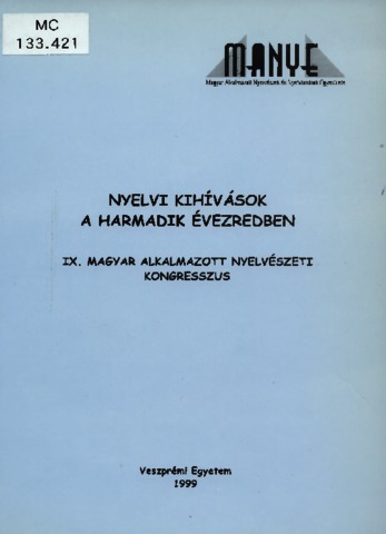Lengyel, Zsolt and Navracsics, Judit and Nádasi, Edit, eds. (1999) Nyelvi kihívások a harmadik évezredben : IX. Magyar Alkalmazott Nyelvészeti Kongresszus. Magyar Alkalmazott Nyelvészeti Kongresszus . Veszprémi Egyetem Alkalmazott Nyelvészeti Tanszéke, Veszprém. ISBN 963-922-030-2