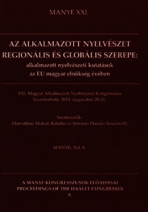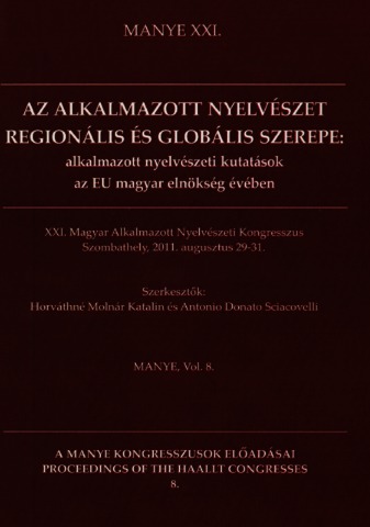 Horváthné Molnár, Katalin and Antonio Donato, Sciacovelli, eds. (2012) Az alkalmazott nyelvészet regionális szerepe: alkalmazott nyelvészeti kutatások az EU magyar elnökségének az évében. A MANYE Kongresszusok Előadásai . Magyar Alkalmazott Nyelvészek és Nyelvtanárok Egyesülete, Nyugat-magyarországi Egyetem, Budapest - Szombathely - Sopron. ISBN 978-963-334-052-3