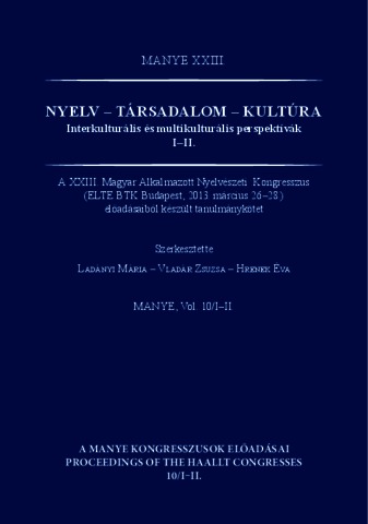 Ladányi, Mária and Vladár, Zsuzsa and Hrenek, Éva, eds. (2014) Nyelv - társadalom - kultúra: interkulturális és multikulturális perspektívák I–II. A MANYE Kongresszusok Előadásai . Magyar Alkalmazott Nyelvészek és Nyelvtanárok Egyesülete, Tinta Könyvkiadó, Budapest. ISBN 978-615-5219-67-2